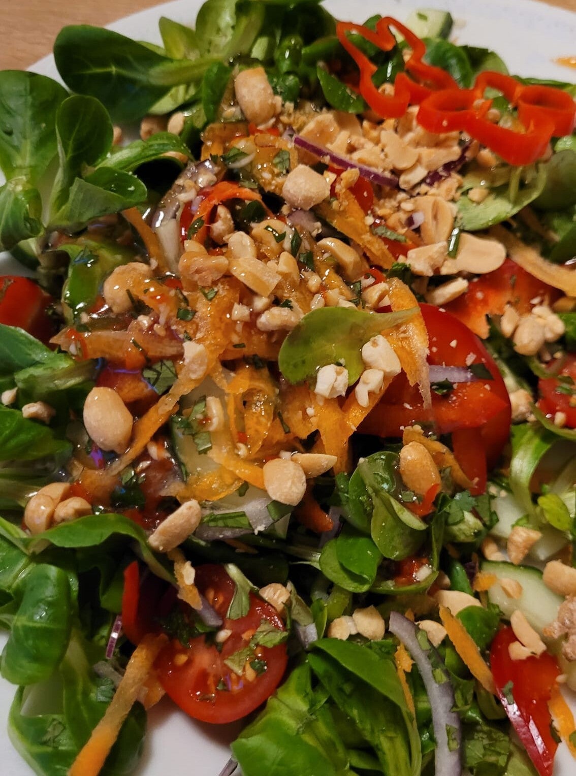 - Toss all salad ingredients together, then sprinkle the chopped peanuts over top. Drizzle with dressing.